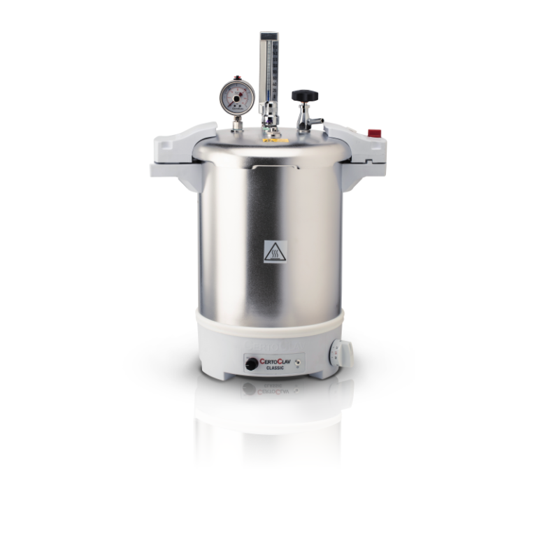 Aluminum autoclave for sterilization at 125°C or 140°C. Venting by flow procedure. Manual operation. Tried and tested design. 60 years in the market.