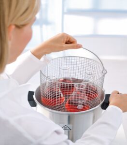The most compact support pressure autoclave in the world. Fully automatic autoclave with support pressure for sterilization of canned food, cans and culture media in sealed bottles. With touch screen and flexible media temperature sensor. Ideal for test laboratories with solid containers up to max. 1 kg.